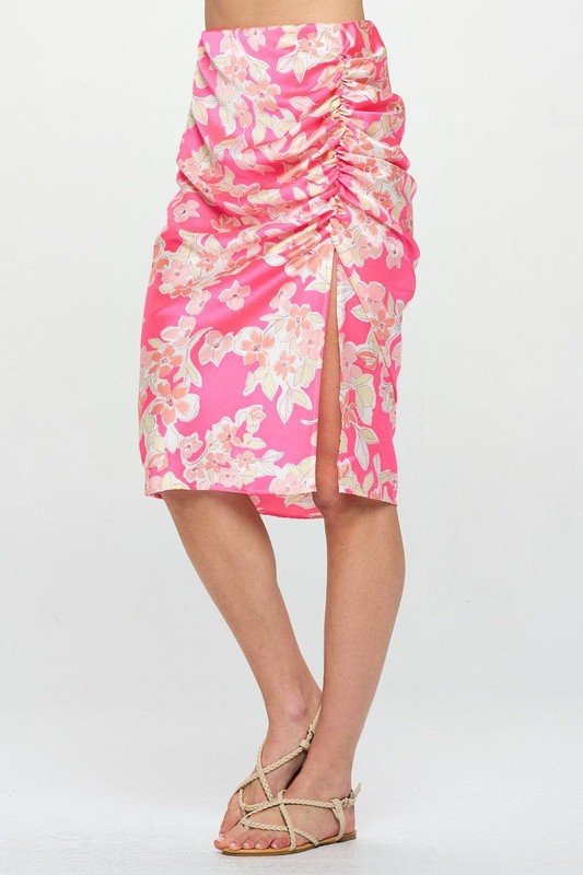 Made in USA Midi Scrunch Slit Satin Skirt ,Flower Print . Available in other colors.97% Polyester, 3% Spandex