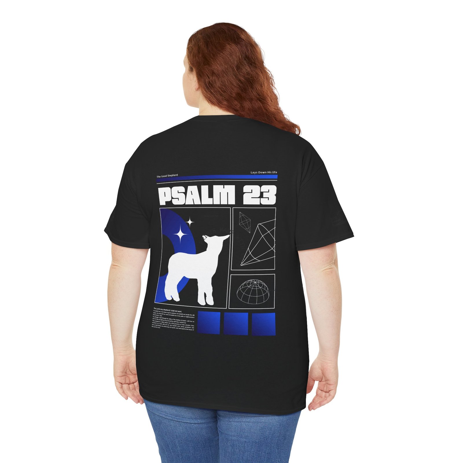 The Lord is my Shepherd I shall not want scripture is a reminder that Jesus is always with us during the good and bad. This scripture gives us strength when we are going through trials and tribulations. The unisex heavy cotton tee is the basic staple of any wardrobe. It is the foundation upon which casual fashion grows. All it needs is a personalized design to elevate things to profitability. The specially spun fibers provide a smooth surface for premium printing vividity and sharpness. No side seams mean there are no itchy interruptions under the arms. The shoulders have tape for improved durability. .: 100% cotton (fiber content may vary for different colors) .: Medium fabric (5.3 oz/yd² (180 g/m²)) .: Classic fit .: Tear-away label .: Runs true to size S M L XL 2XL 3XL 4XL 5XL Width, in 17.99 20.00 21.97 23.98 25.98 27.99 30.04 31.97 Length, in 28.00 29.00 30.00 31.00 32.00 33.00 34.00 35.00 Sleeve length, in 7.24 7.76 8.23 8.74 9.25 9.76 10.24 10.75